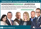 Tervetuloa lauantaina 12.3. klo 13 Lahteen Laununaukiolle tapaamaan Kokoomuspäättäjiä eduskunnasta! Oma kansanedustajamme Kalle Jokinen, Kokoomusministerit sekä tuore puoluesihteeri Janne Pesonen odottavat näkevänsä sinut Lahdessa Lanunaukiolla lauantaina 12.3. klo 13-14. Hernerokkaakin tajolla! Tervetuloa! |